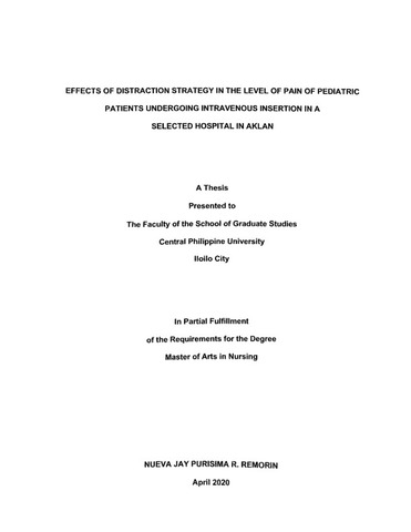 Remorin, N. J. P. R. (2020). Effects of distraction strategy in the level of pain of pediatric patients undergoing intravenous insertion in a selected hospital in Aklan (Unpublished Master’s thesis). Central Philippine University, Jaro, Iloilo City.