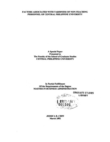 Chin, J. B. (2002). Factors associated with tardiness of non-teaching personnel of Central Philippine University (Unpublished Master's special paper). Central Philippine University, Jaro, Iloilo City.